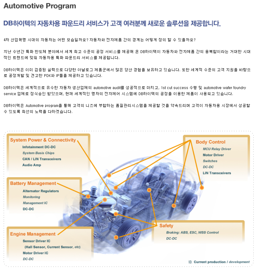 특히, 0.18um BCDMOS 공정을 셰계 최초로 개발한 이후 Analog/Power 분야에서는 세계 최고 수준의 기술력을 확보 하고 있습니다.