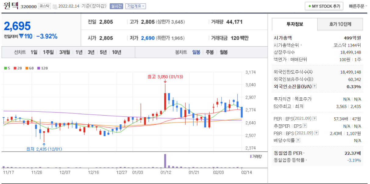 윈텍의 시가총액은 499억원, 현재주가는 2,695원입니다. 윈텍의 최대주주 지분율은 72프로 정도로 시중에서 거래가능 수량은 약 28프로 정도로 보여집니다. 이정도면 품절주로 봐도 무방 할 듯 하네요.